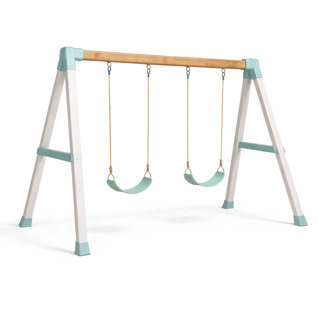 Set di altalene da esterno in legno e acciaio con seggiolini in plastica verde menta