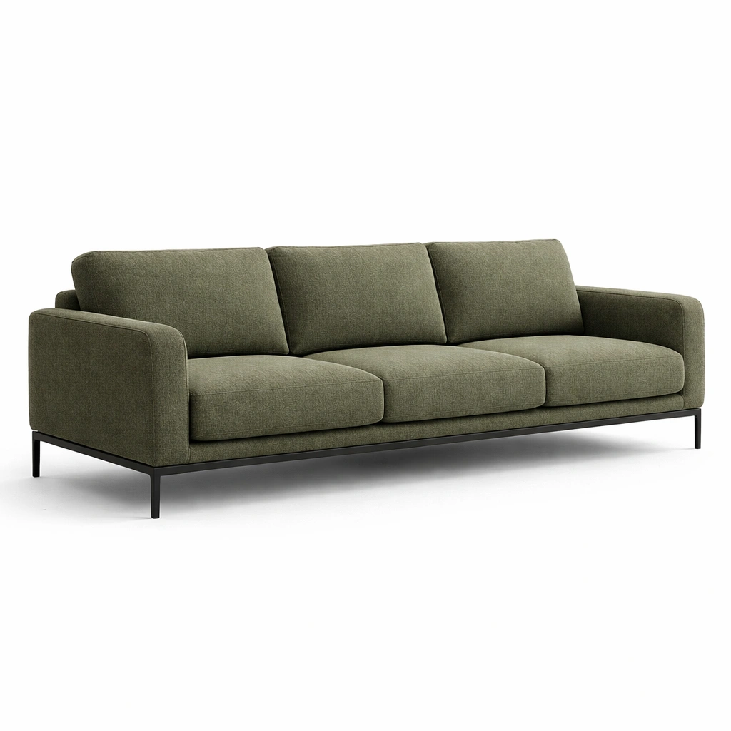 Divano a tre posti con rivestimento in tessuto di poliestere e struttura in metallo rinforzato. I cuscini sono imbottiti con schiuma per un comfort ottimale.