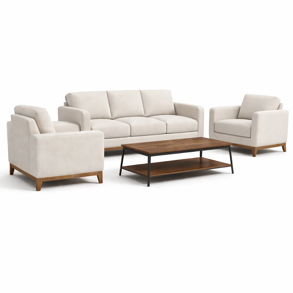 Il set comprende un divano e due poltrone con rivestimento in tessuto di poliestere di colore crema e gambe in legno. La struttura del divano e delle poltrone è in legno. Il tavolino rettangolare è realizzato con un ripiano in legno e una struttura in metallo nero.