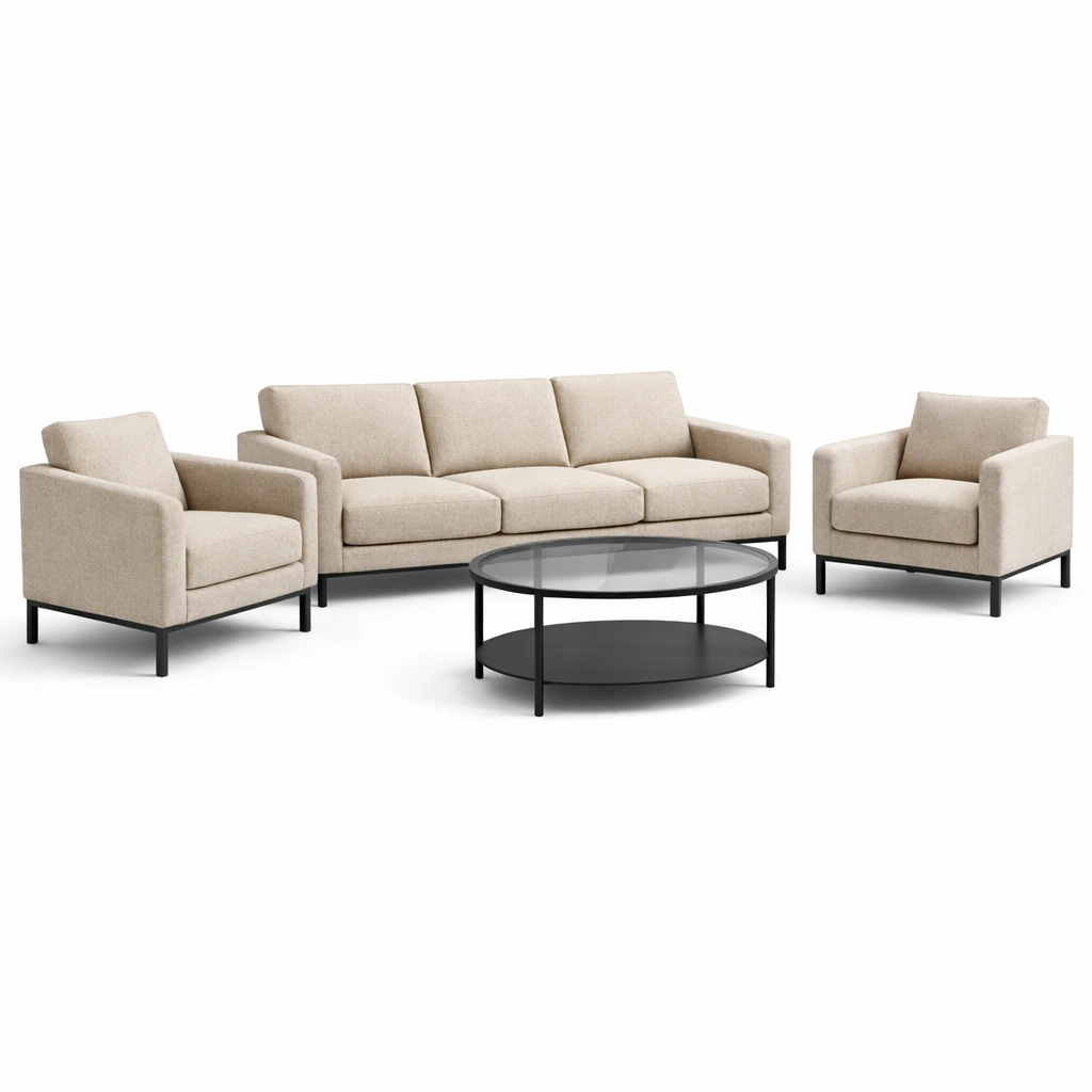 Set di divani e poltrone in tessuto beige con tavolino in metallo e vetro temperato