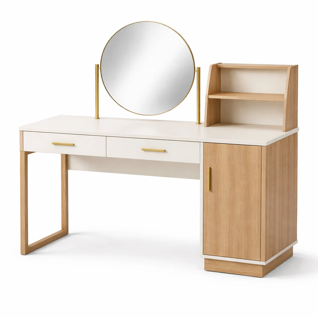 Tavolo da trucco in legno e mdf con specchio e contenitore